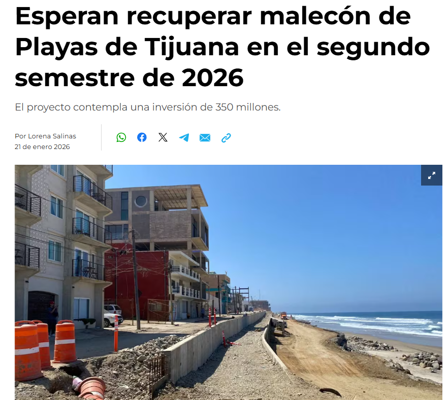 Lorena Salinas, (21 de enero, 2026). Esperan recuperar malecón de Playas de Tijuana en el segundo semestre de 2026. El imparcial Disponible en https://www.elimparcial.com/tij/tijuana/2026/01/20/recuperacion-del-malecon-de-playas-de-tijuana-concluya-en-el-segundo-semestre-de-2026/