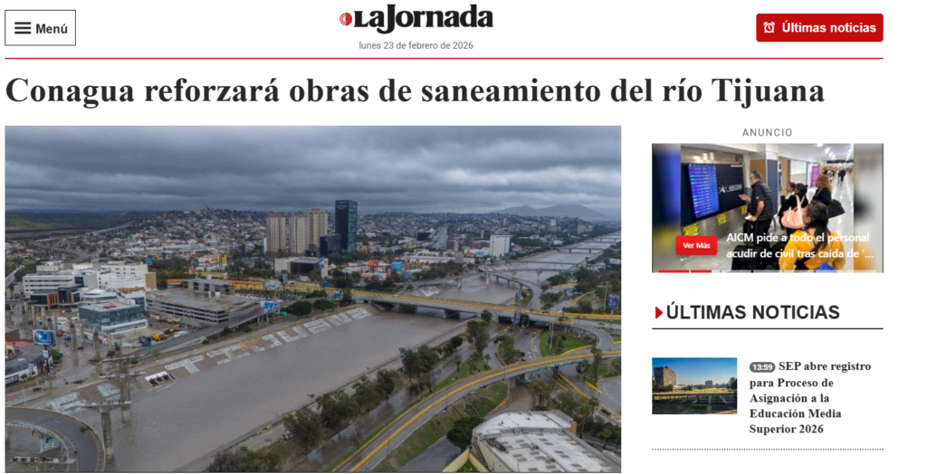 Alonso Urrutia, (30 de enero, 2026). Conagua reforzará obras de saneamiento del río Tijuana. La Jornada. Disponible en https://www.jornada.com.mx/noticia/2026/01/30/estados/conagua-reforzara-obras-de-saneamiento-del-rio-tijuana