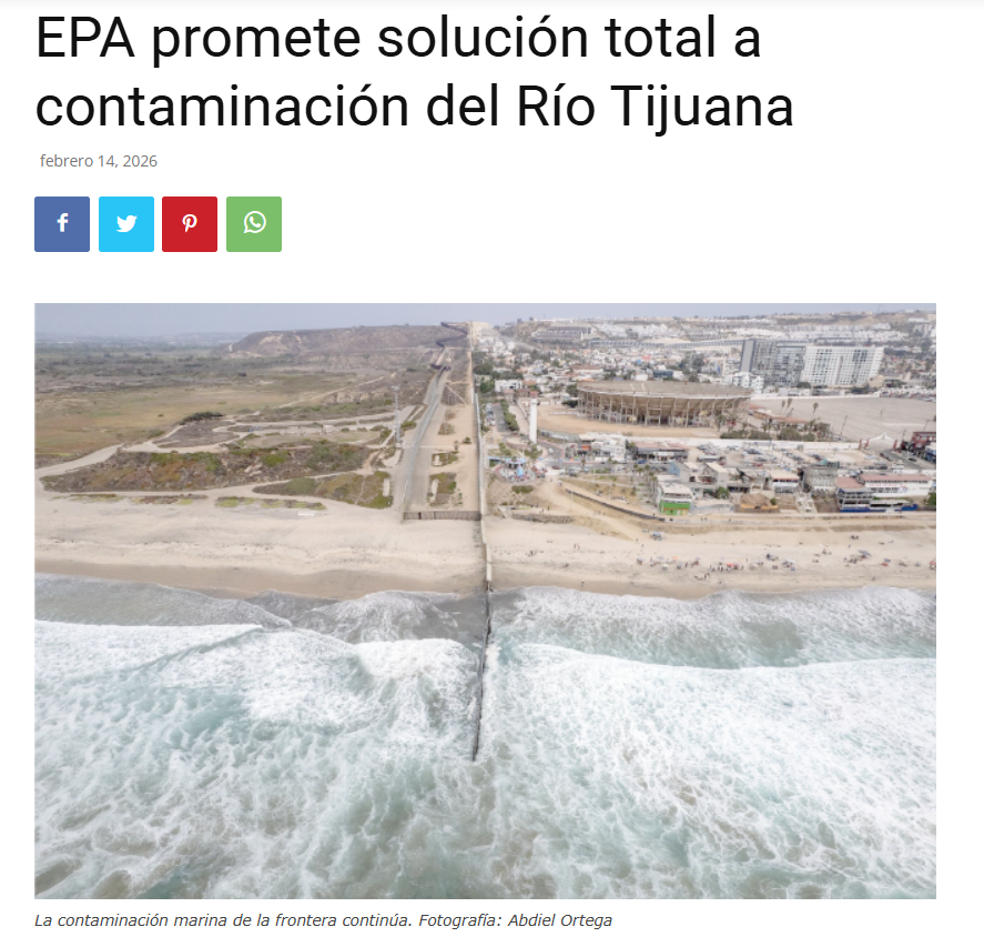 Abdiel Ortega, (14 de febrero, 2026). EPA promete solución total a contaminación del Río Tijuana. Infobaja. Disponible en https://www.infobaja.info/epa-promete-solucion-total-a-contaminacion-del-rio-tijuana/