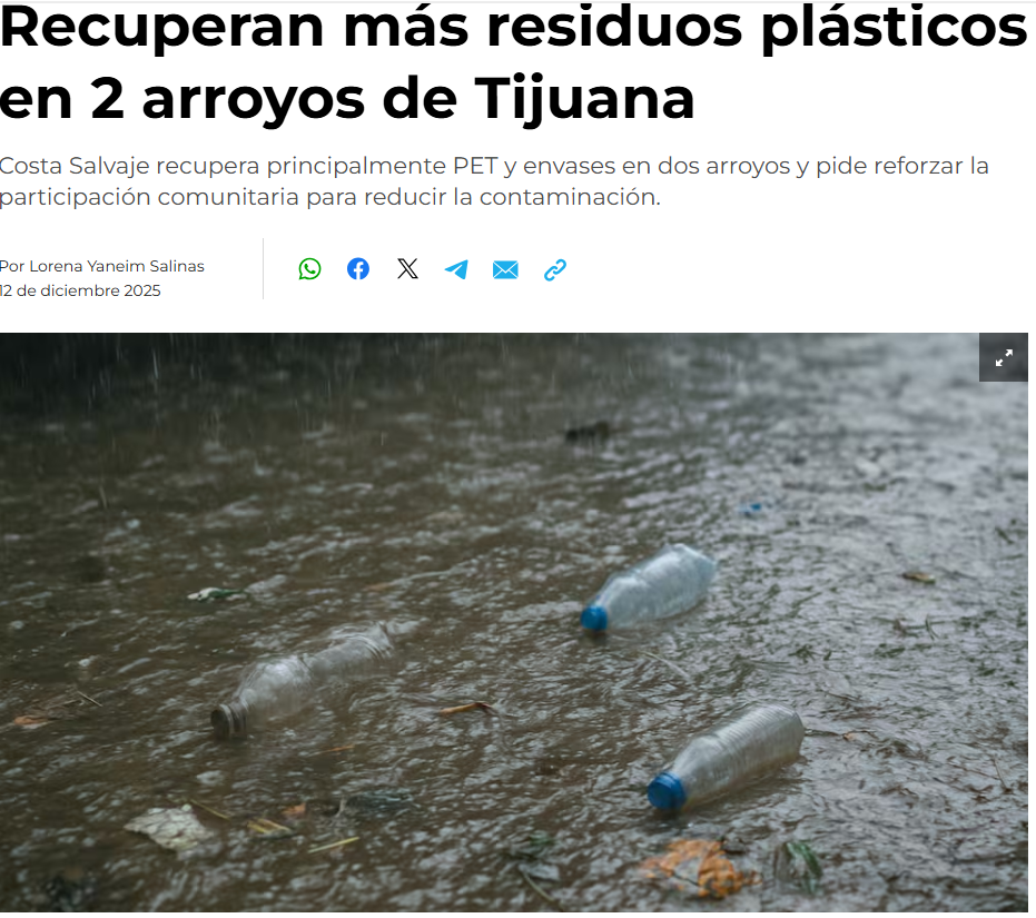 Lorena Yaneim Salinas (12 de diciembre 2025) Recuperan más residuos plásticos en 2 arroyos de Tijuana. El imparcial. Disponible en: https://www.elimparcial.com/tij/tijuana/2025/12/11/mas-del-90-de-residuos-en-arroyos-de-tijuana-son-plasticos-llaman-a-mayor-responsabilidad-ciudadana/