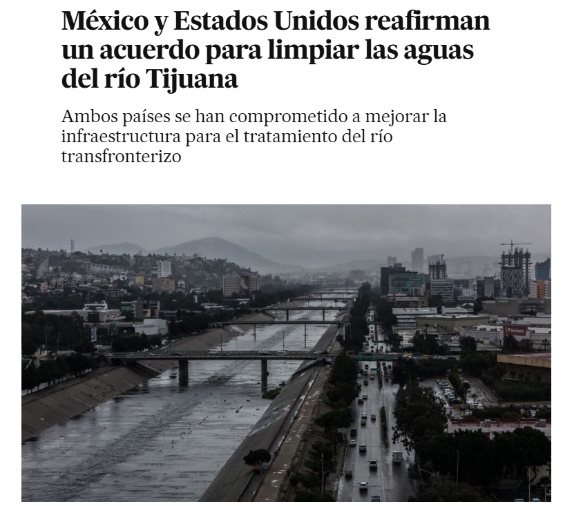 Patricia San Juan Flores (15 de diciembre 2025) México y Estados Unidos reafirman un acuerdo para limpiar las aguas del río Tijuana. El Pais. Disponible en: https://elpais.com/mexico/2025-12-16/mexico-y-estados-unidos-reafirman-un-acuerdo-para-limpiar-las-aguas-del-rio-tijuana.html