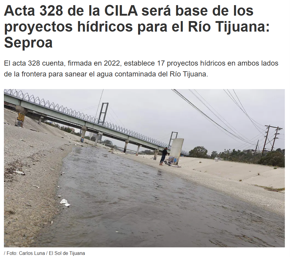 Adelina Dayebi Pazos (17 de diciembre 2025) Acta 328 de la CILA será base de los proyectos hídricos para el Río Tijuana: Seproa. El Sol de Tijuana. Disponible en: https://oem.com.mx/elsoldetijuana/local/acta-328-de-la-cila-sera-base-de-los-proyectos-hidricos-para-el-rio-tijuana-seproa-27321929