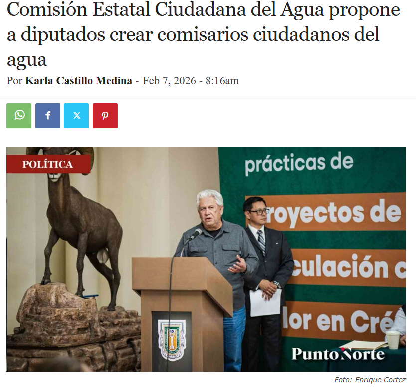 Karla Castillo Medina, (7 de febrero, 2026). Comisión Estatal Ciudadana del Agua propone a diputados crear comisarios ciudadanos del agua. Punto Norte. Disponible en https://puntonorte.info/2026/02/07/comision-estatal-ciudadana-del-agua-propone-a-diputados-crear-comisarios-ciudadanos-del-agua/