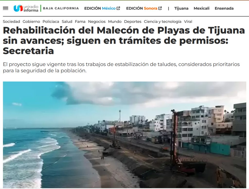 Octavio Fabela, (10 de febrero, 2026). Rehabilitación del Malecón de Playas de Tijuana sin avances; siguen en trámites de permisos: Secretaria. Uniradio. Disponible en https://www.uniradiobaja.com/gobierno/rehabilitacion-malecon-playas-tijuana-avances-siguen-tramites-permisos-secretaria-n868140