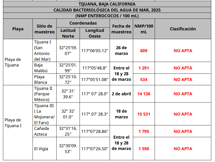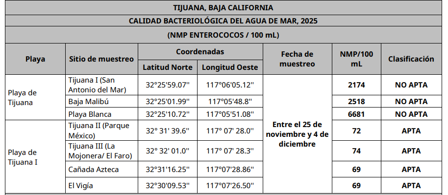 Datos de los resultados mensuales del monitoreo de calidad de agua del mar para el Municipio de Tijuana como resultado de los muestreos realizados sobre la calidad bacteriológica dentro del Marco del Programa Nacional de Playas Limpias.