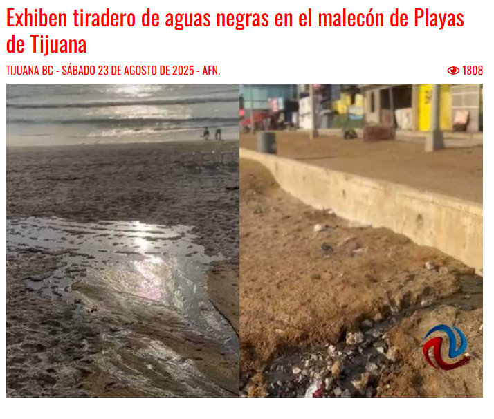 AFN TIJUANA (23 de agosto 2025) Exhiben tiradero de aguas negras en el malecón de Playas de Tijuana. AFN TIJUANA. Disponible en: https://www.afntijuana.info/informacion_general/167268_exhiben_tiradero_de_aguas_negras_en_el_malecon_de_playas_de_tijuana