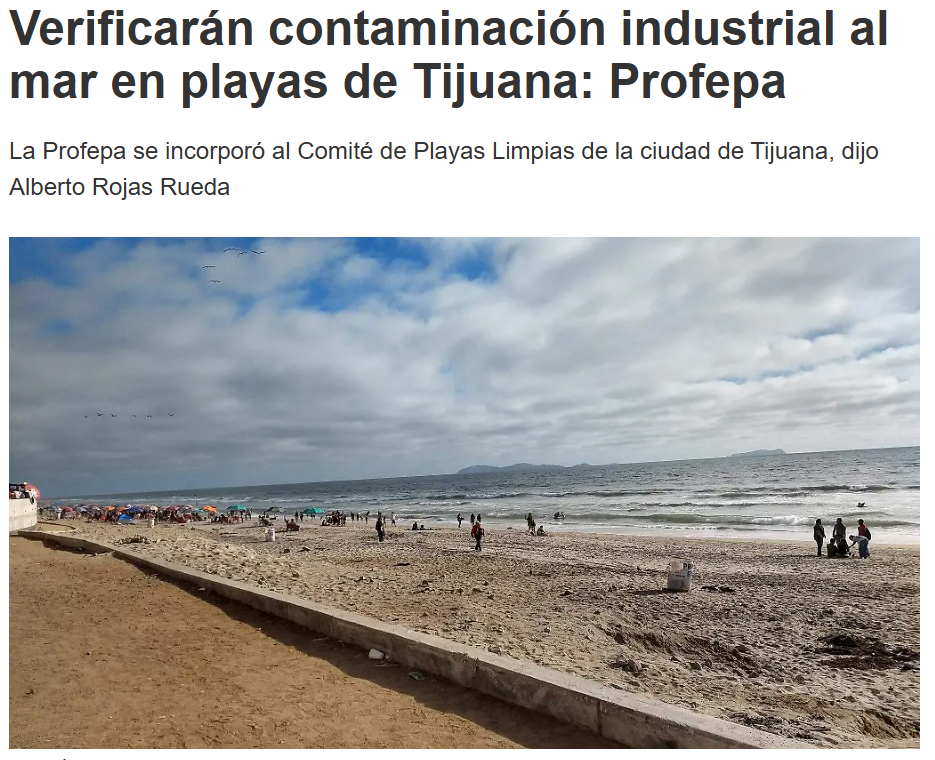 Eduardo Jaramillo Castro (24 de agosto 2025) Verificarán contaminación industrial al mar en playas de Tijuana: Profepa. El Sol Tijuana. Disponible en: https://oem.com.mx/elsoldetijuana/local/verificaran-contaminacion-industrial-al-mar-en-playas-de-tijuana-profepa-25391778