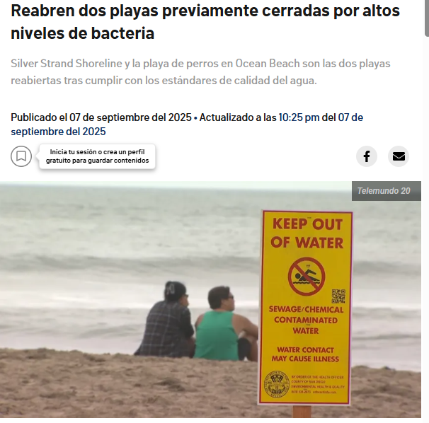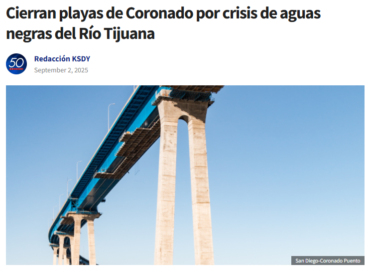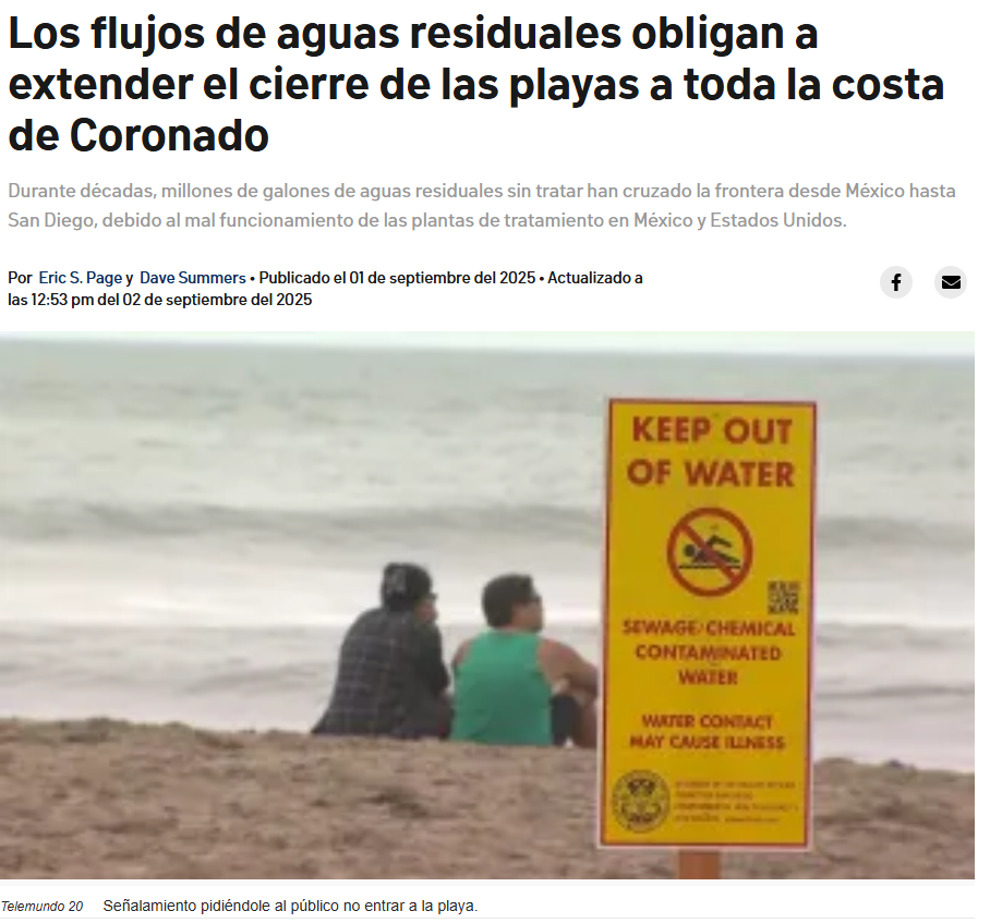 Eric S. Page & Dave summers (1 septiembre, 2025) Los flujos de aguas residuales obligan a extender el cierre de las playas a toda la costa de Coronado. Telemundo 20. Disponible en: https://www.telemundo20.com/noticias/local/cierres-playas-imperial-beach-empanan-trabajo/2477009/?amp=1
