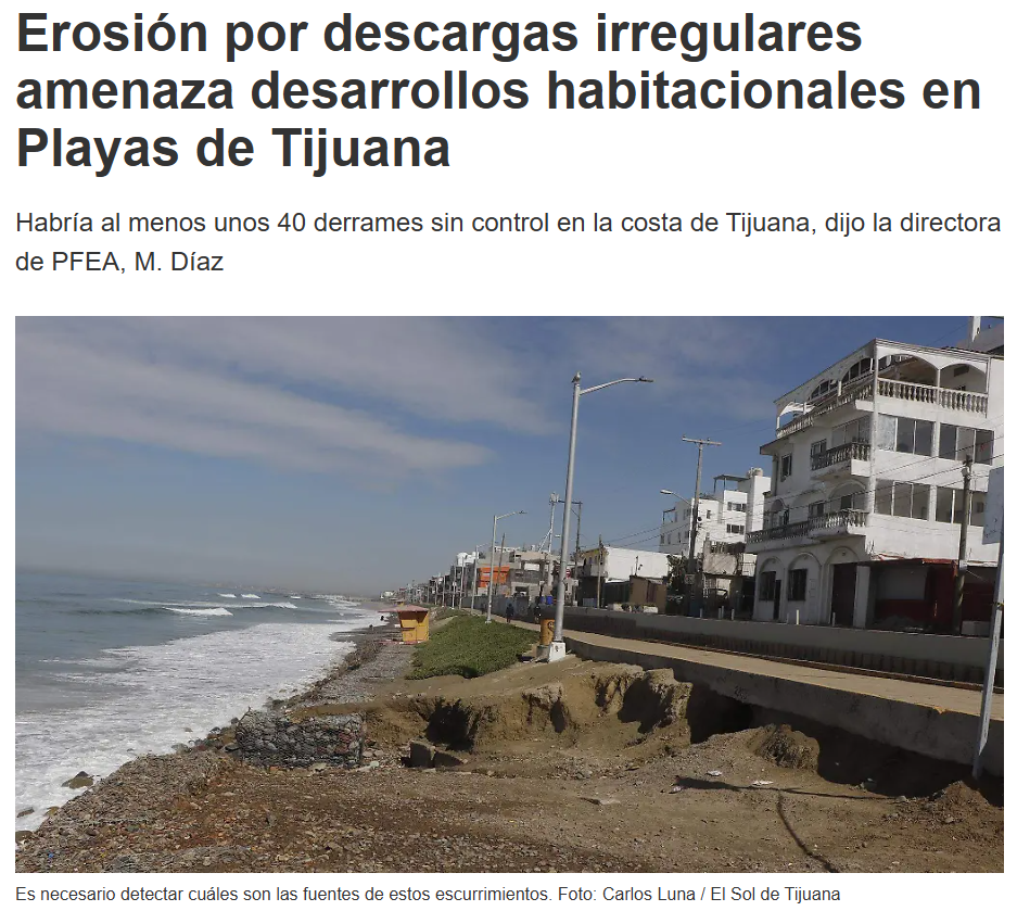 Eduardo Jaramillo Castro (3 de septiembre 2025) Erosión por descargas irregulares amenaza desarrollos habitacionales en Playas de Tijuana. El Sol de Tijuana. Disponible en: https://oem.com.mx/elsoldetijuana/local/erosion-por-descargas-irregulares-amenaza-desarrollos-habitacionales-en-playas-de-tijuana-25558484
