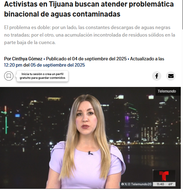 20 San Diego (5 septiembre, 2025) Activistas en Tijuana buscan atender problemática binacional de aguas contaminadas. 20 San Diego. Disponible en: https://www.telemundo20.com/noticias/mexico/activistas-en-tijuana-buscan-atender-problematica-binacional-de-aguas-contaminadas/2477724/