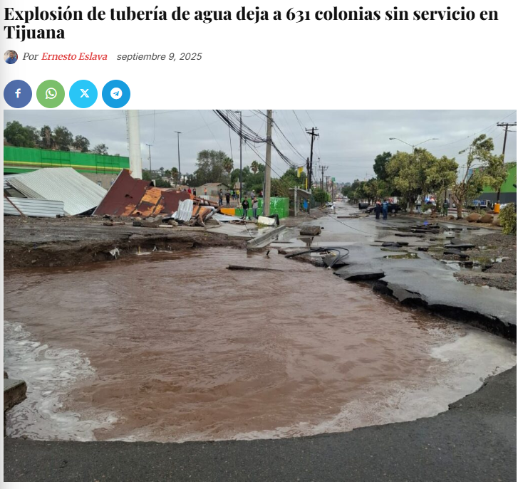 Ernesto Eslava (9 septiembre 2025) Explosión de tubería de agua deja a 631 colonias sin servicio en Tijuana. ZETA. Disponible en: https://zetatijuana.com/2025/09/explosion-de-tuberia-de-agua-deja-a-631-colonias-sin-servicio-en-tijuana/