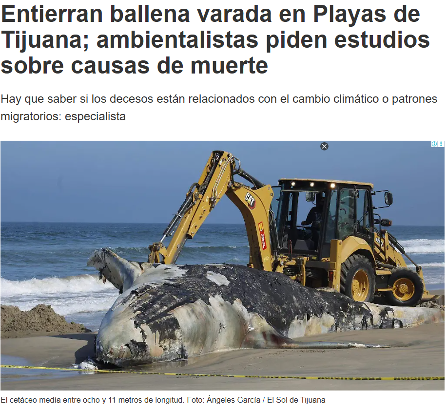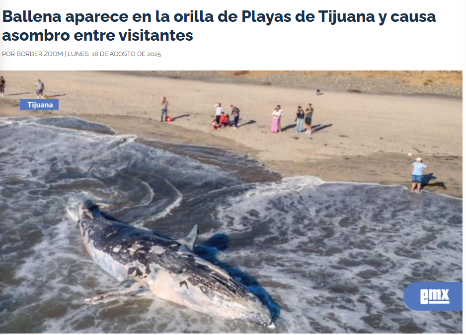 Juan Miguel Hernández (19 de agosto, 2025) Entierran ballena varada en Playas de Tijuana; ambientalistas piden estudios sobre causas de muerte. El Sol de Tijuana. Disponible en: https://oem.com.mx/elsoldetijuana/local/inicia-entierro-de-ballena-hallada-muerta-este-lunes-en-playas-de-tijuana-25291558