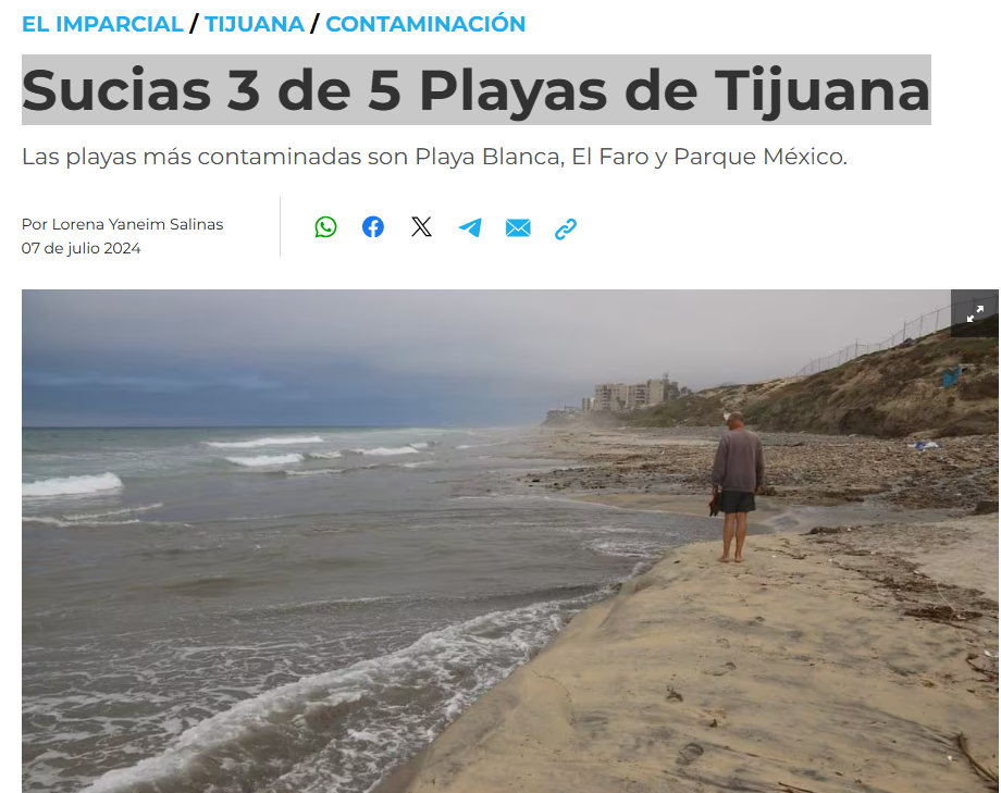 Lorena Yaneim Salinas (19 de julio 2024) No aptas mayoría de las playas de Tijuana. EL IMPARCIAL. Disponible en: https://www.elimparcial.com/tij/tijuana/2024/07/19/recomiendan-no-utilizar-las-playas-de-tijuana-para-uso-recreativo/