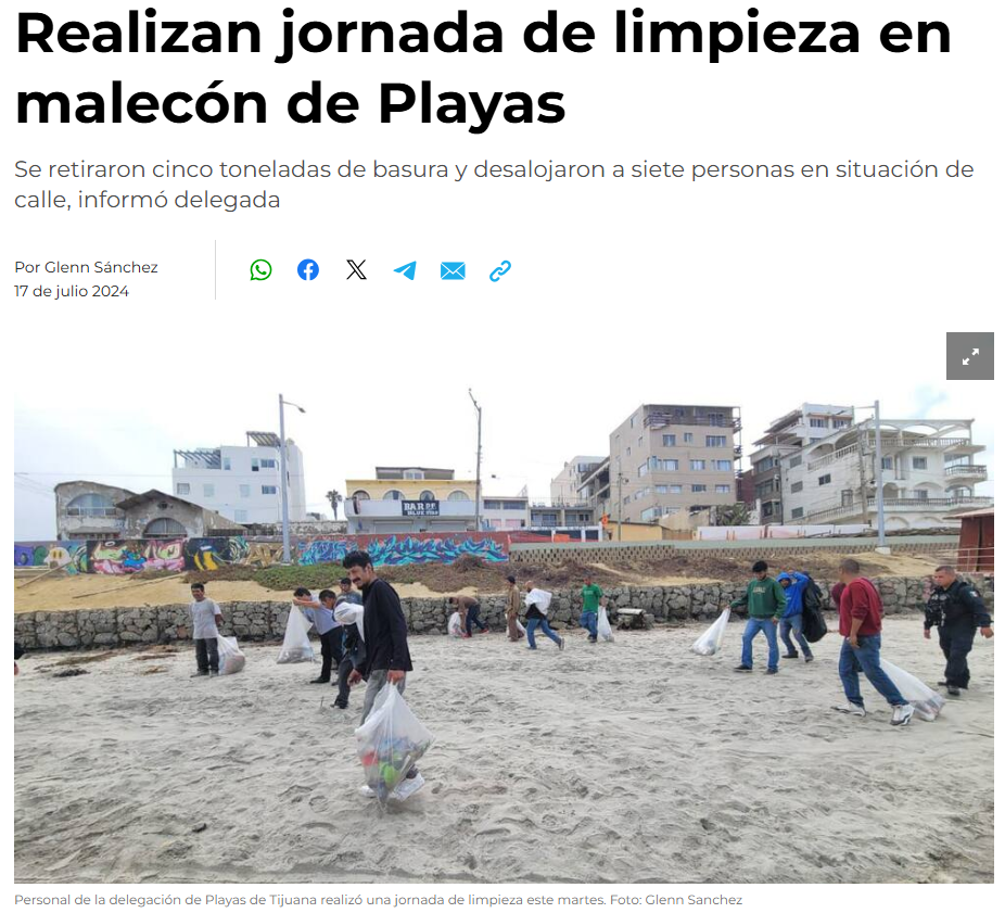 Glenn Sánchez (17 de julio 2024) Realizan jornada de limpieza en malecón de Playas. EL IMPARCIAL. Disponible en: https://www.elimparcial.com/tij/tijuana/2024/07/16/realizan-operativo-y-jornada-de-limpieza-en-el-malecon-de-playas-de-tijuana/
